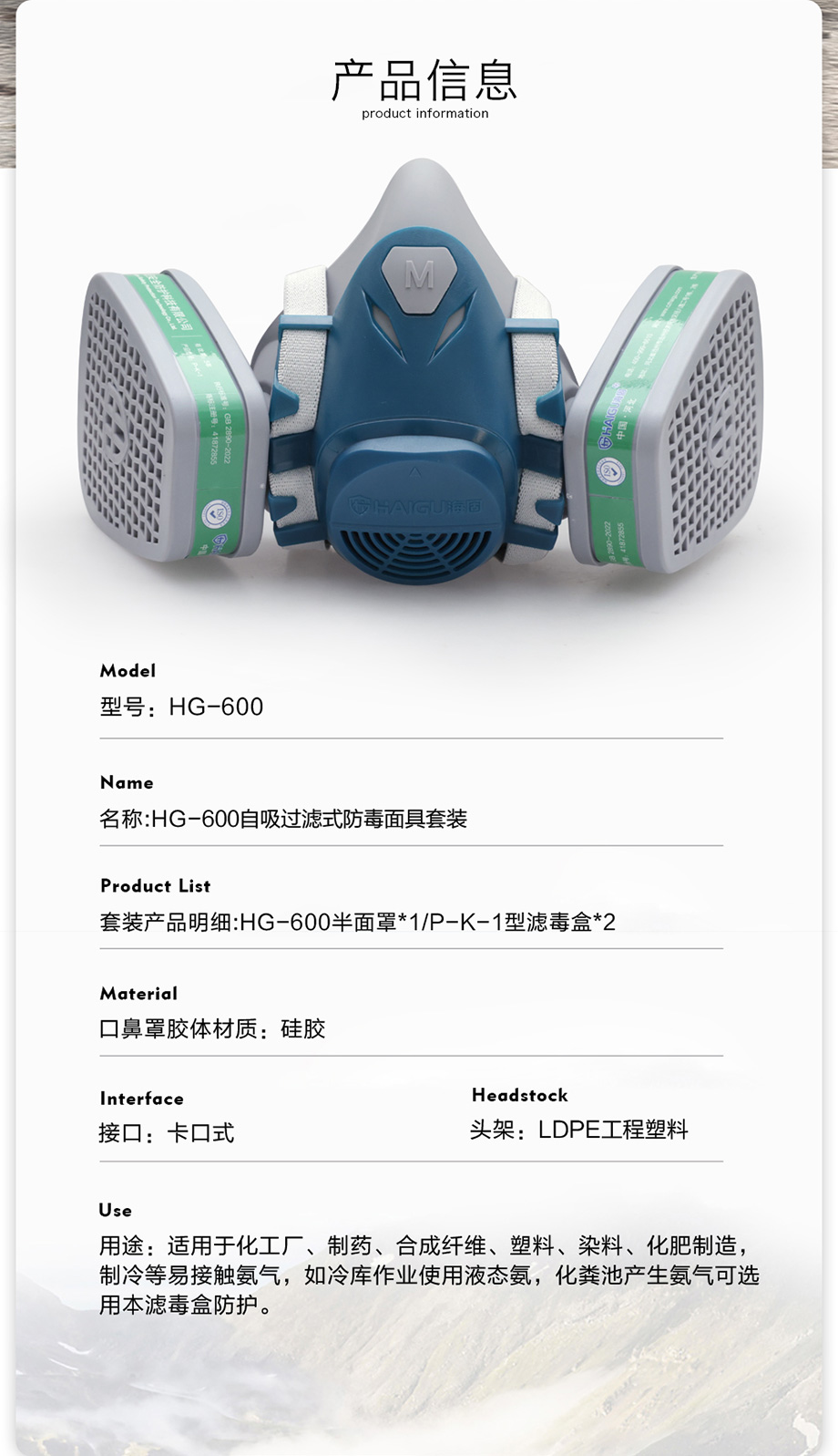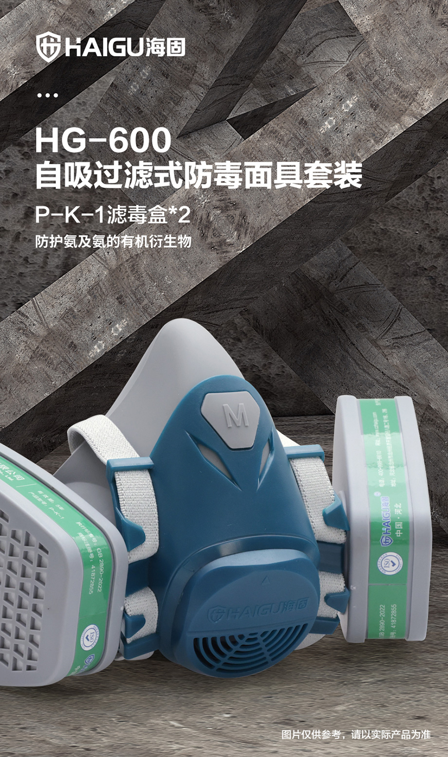 海固600半面罩+P-K-1濾毒盒 防護氨及氨的有機衍生物套裝