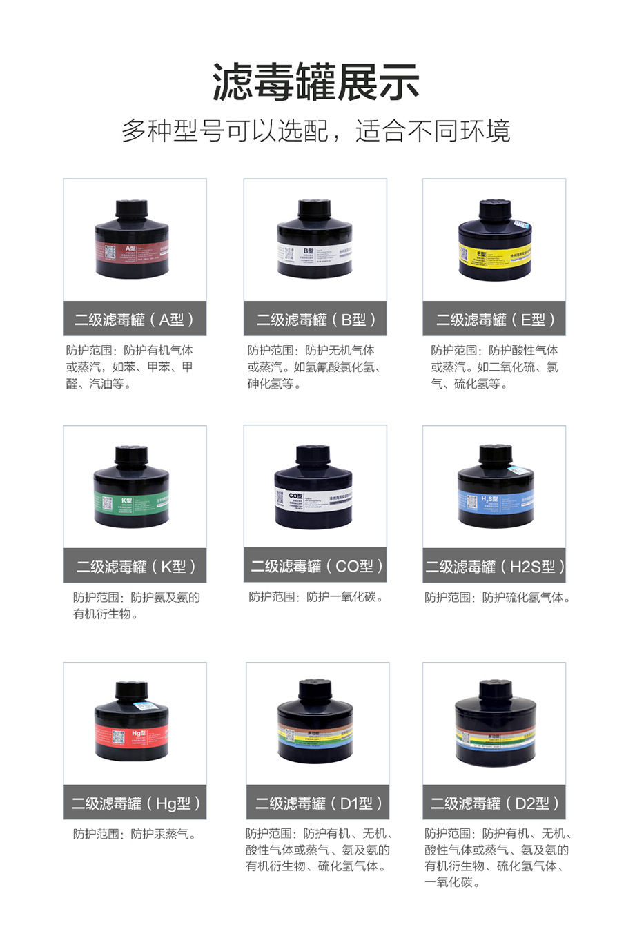 防護(hù)范圍:主要防護(hù)有機(jī)、無(wú)機(jī)、酸性氣體或蒸汽、氨及氨的有機(jī)衍生物及硫化氫氣體