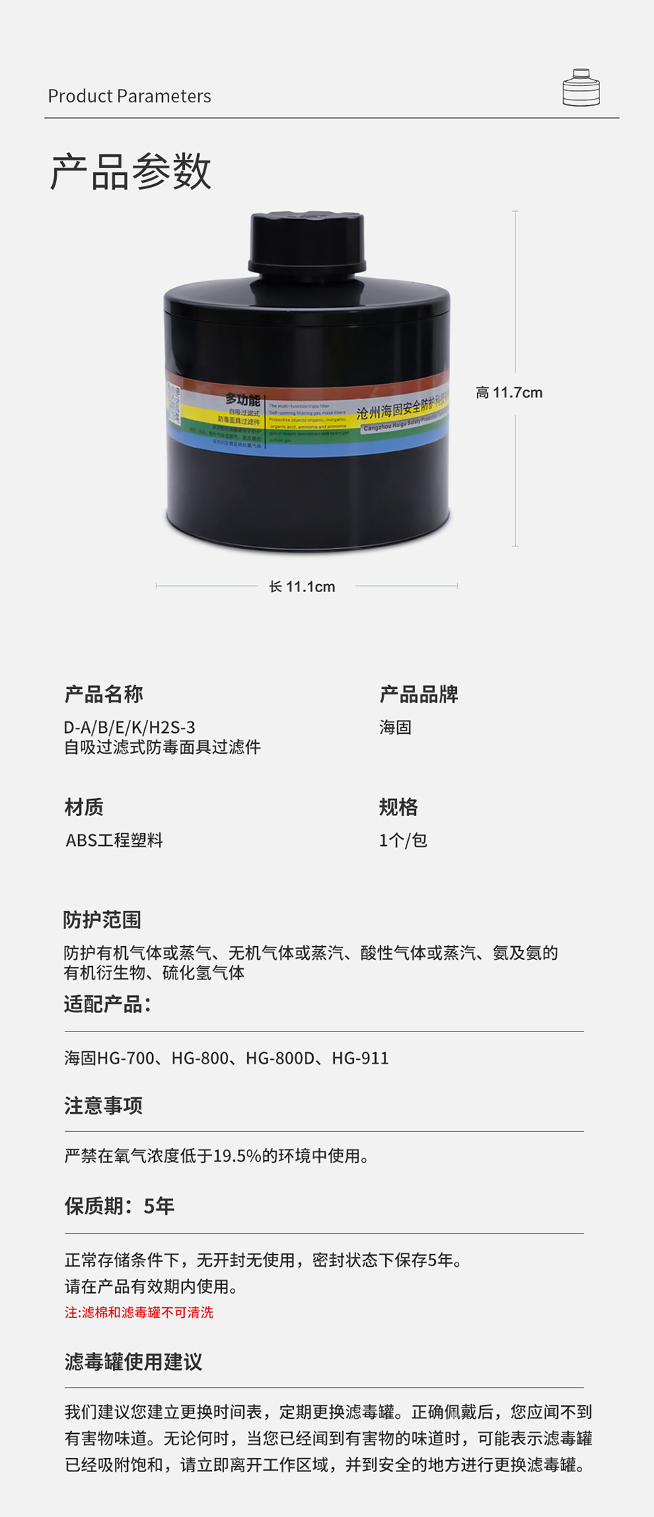 產(chǎn)品規(guī)格:ABS濾毒罐