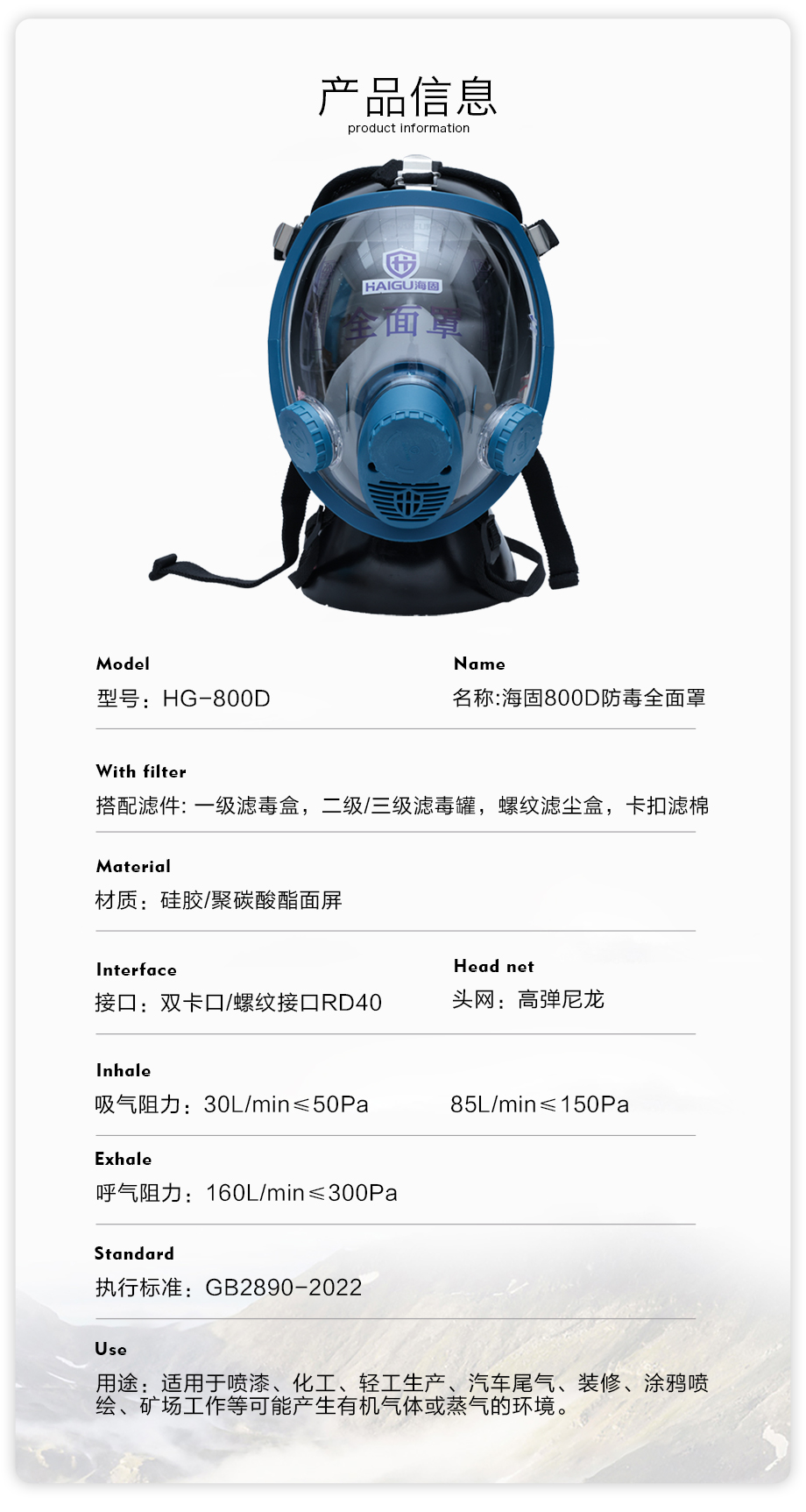 海固800D全面罩+HG-ABS/P-A-3濾毒罐 甲醛 醇類防護套裝